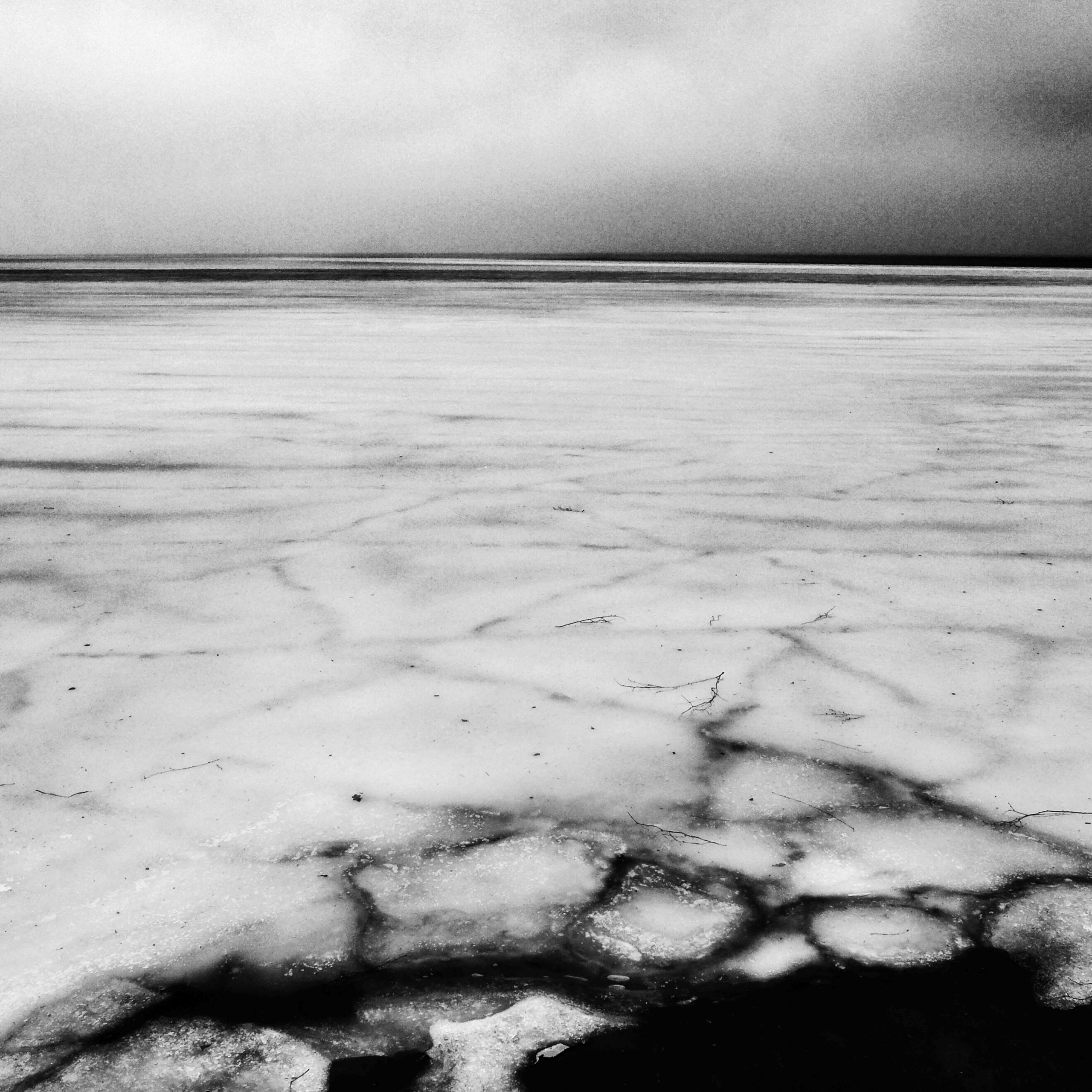 På en vänstersida ser man en böjd ledstång av järn som associativt går över till en lika mörk horisontlinje över ett fruset vatten på uppslagets högra sida. Det är så snyggt.